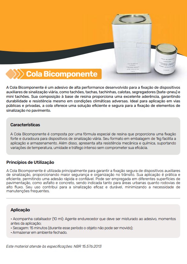 A Cola Bicomponente é um adesivo de alta performance desenvolvido para a fixação de dispositivos auxiliares de sinalização viária, como tachões, tachas, tachinhas, calotas, segregadores (bate-pneu) e mini tachões.