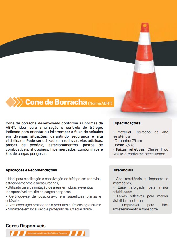 O Cone de Borracha (Norma ABNT) é desenvolvido conforme as normas da ABNT, sendo ideal para sinalização e controle de tráfego em rodovias, vias públicas, pedágios, estacionamentos, postos de combustíveis, shoppings, hipermercados, condomínios e kits de cargas perigosas. Garante segurança e alta visibilidade em diferentes contextos urbanos e rodoviários.