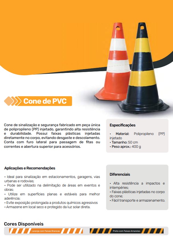 O Cone de PVC é uma solução prática e eficiente para sinalização e segurança em ambientes urbanos e industriais. Fabricado em peça única de polipropileno (PP) injetado, possui excelente resistência a impactos e às condições climáticas adversas.