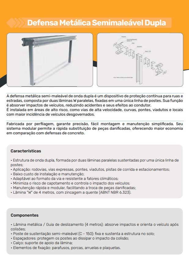 A defensa metálica semi-maleável de onda dupla é composta por duas lâminas W paralelas em uma única linha de postes. Sua função é absorver impactos, reduzir acidentes e proteger ocupantes dos veículos.