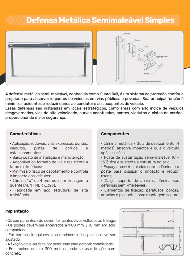 A defensa metálica semi-maleável, conhecida como Guard Rail, é um sistema de proteção contínua projetado para absorver impactos de veículos, minimizando acidentes e danos.