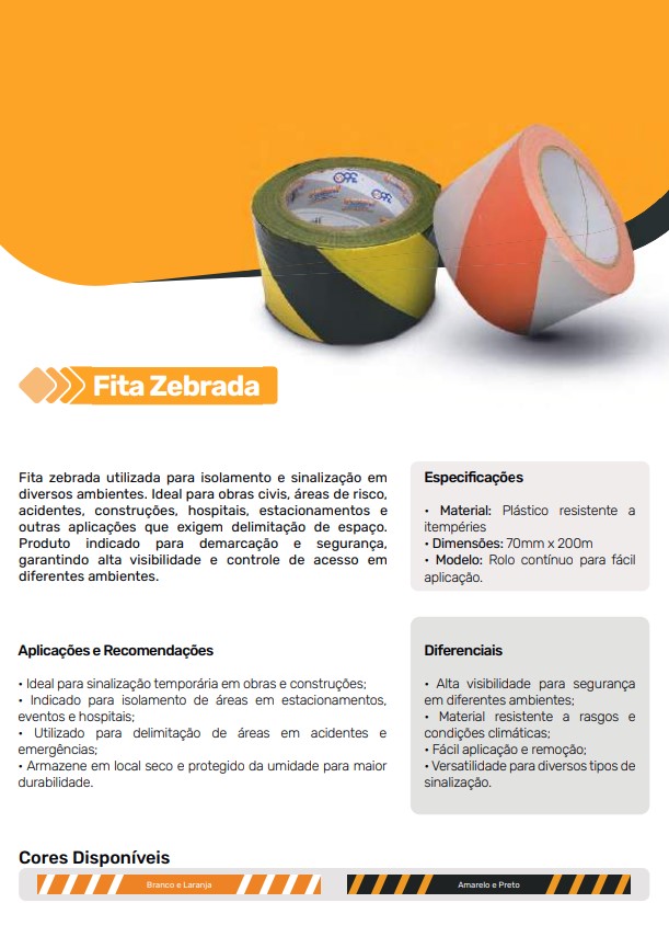 Fita zebrada ideal para isolamento e sinalização de áreas de risco, obras e eventos. Alta visibilidade, resistente e de fácil aplicação.