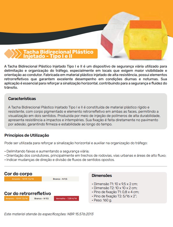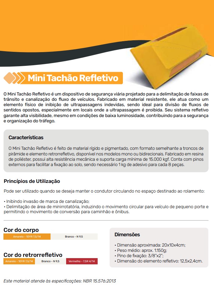 O Mini Tachão Refletivo é um dispositivo de segurança viária projetado para a delimitação de faixas de trânsito e canalização do fluxo de veículos. Fabricado em material resistente, ele atua como um elemento físico de inibição de ultrapassagens indevidas, sendo ideal para divisão de fluxos de sentidos opostos, especialmente em locais onde a ultrapassagem é proibida.