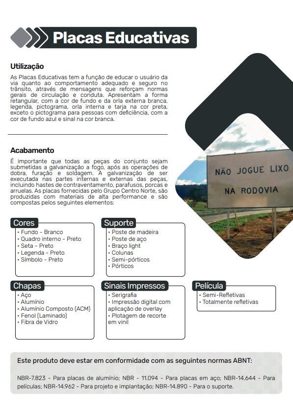 As Placas Educativas têm como principal objetivo educar os usuários das vias públicas, transmitindo mensagens que incentivam comportamentos seguros e corretos no trânsito. Essas mensagens reforçam as normas de circulação e conduta, atuando de forma preventiva para redução de acidentes e conflitos no tráfego.