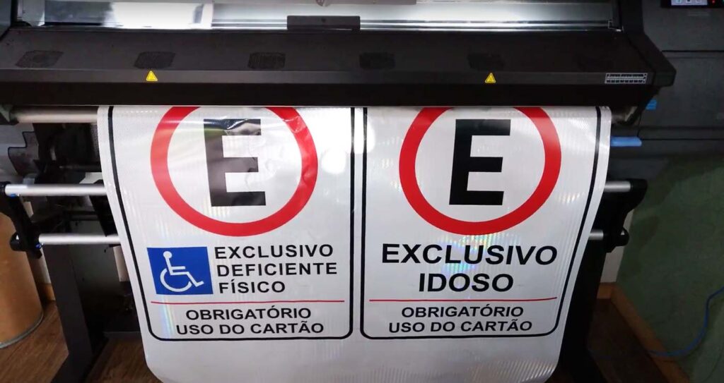 Impressão de sinais para placas de trânsito e urbanas com tecnologia UV, substituindo métodos tradicionais como serigrafia e recorte em vinil. Ideal para personalização, identificação institucional e reposição.