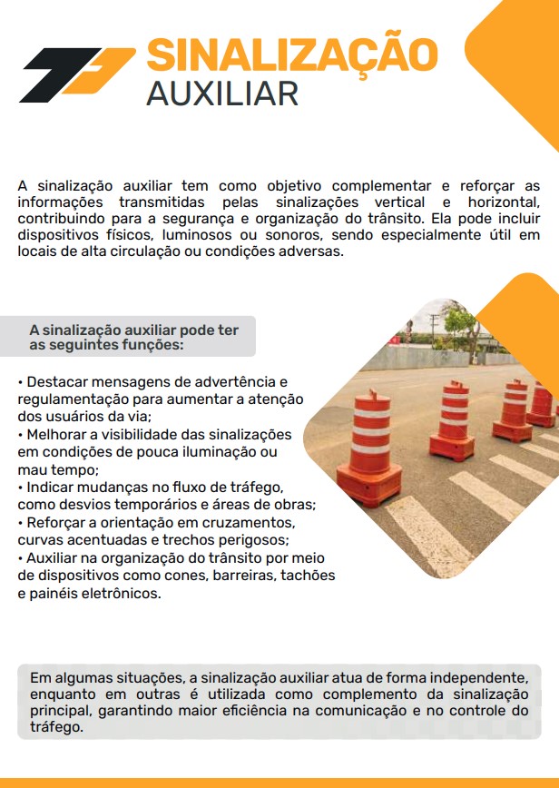 A Sinalização Auxiliar tem papel fundamental na organização e segurança do trânsito, atuando como complemento às sinalizações vertical e horizontal. É composta por elementos físicos, luminosos ou sonoros que reforçam ou ampliam as informações transmitidas aos condutores e pedestres.