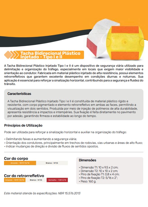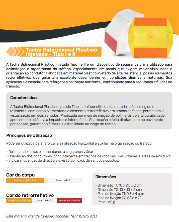 A Tacha Bidirecional Plástico Injetado Tipo I e II é um dispositivo de segurança viária utilizado para delimitação e organização do tráfego. Fabricada em material plástico injetado de alta resistência, possui elementos retrorrefletivos em ambas as faces que garantem excelente desempenho em condições diurnas e noturnas. Sua aplicação reforça a sinalização horizontal e contribui para a fluidez e segurança no trânsito.