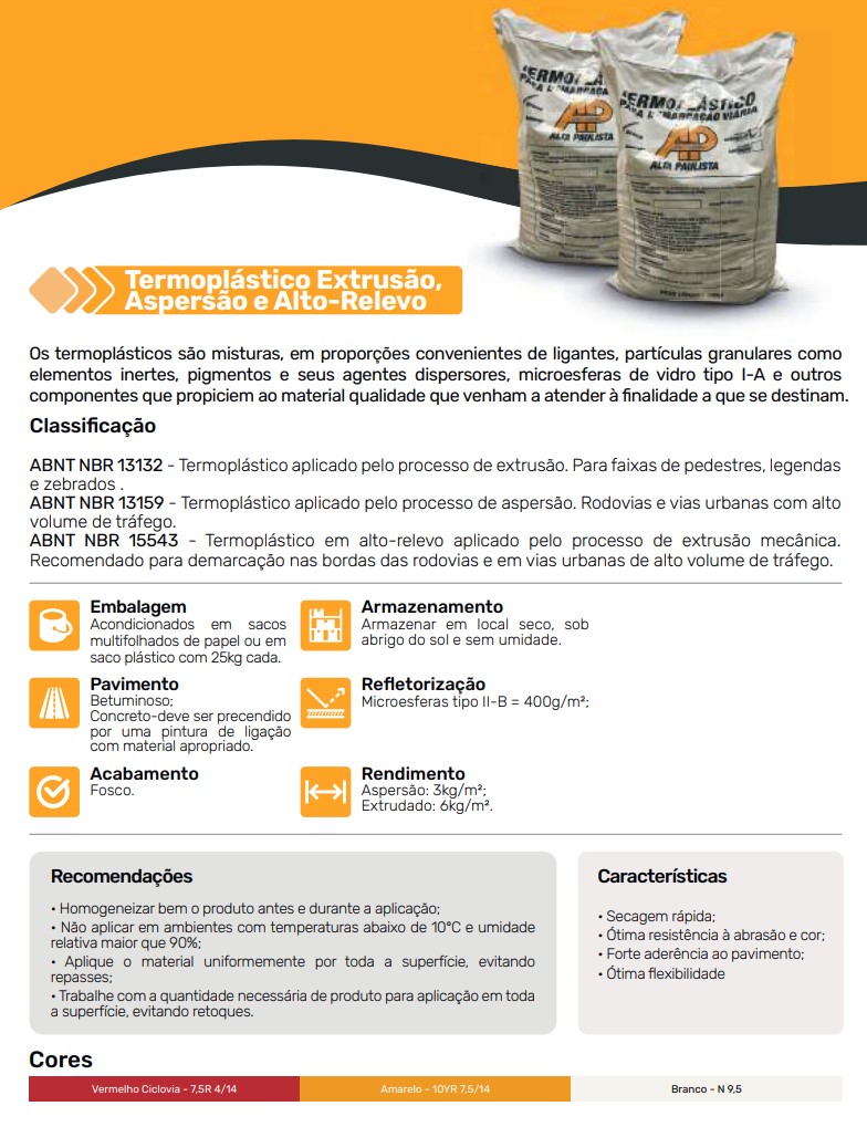 Os Termoplásticos são misturas compostas por ligantes, partículas granulares, elementos inertes, pigmentos e agentes dispersores, microesferas de vidro e outros componentes que proporcionam alta qualidade ao material aplicado em sinalizações horizontais.