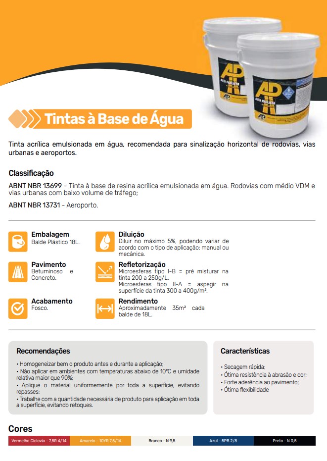 - Refletorização: Microesferas tipo I-B ou tipo I-A, com rendimento entre 300 a 400g/m²